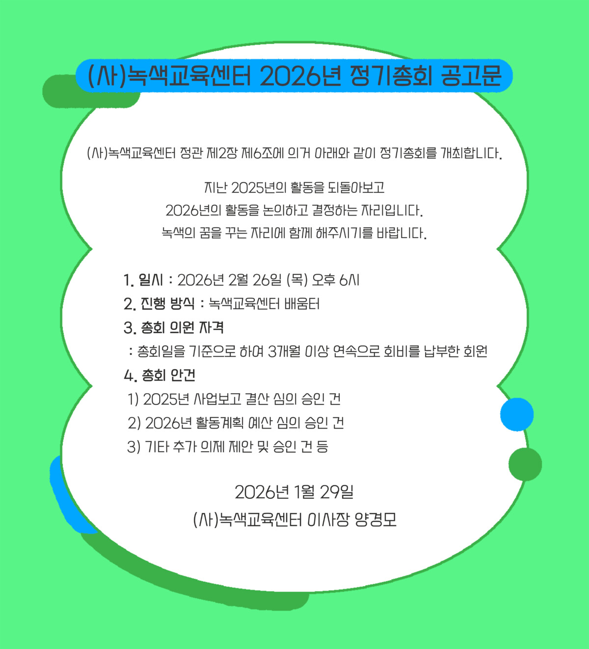 (사)녹색교육센터 정관 제2장 제6조에 의거 아래와 같이 정기총회를 개최합니다.